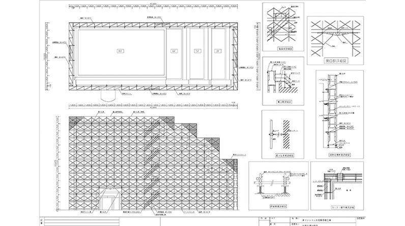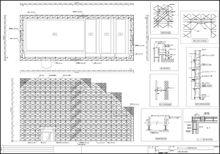 足場倒壊ゼロを目標に安全、安心の仮設計画図と仮設計算を行っております。